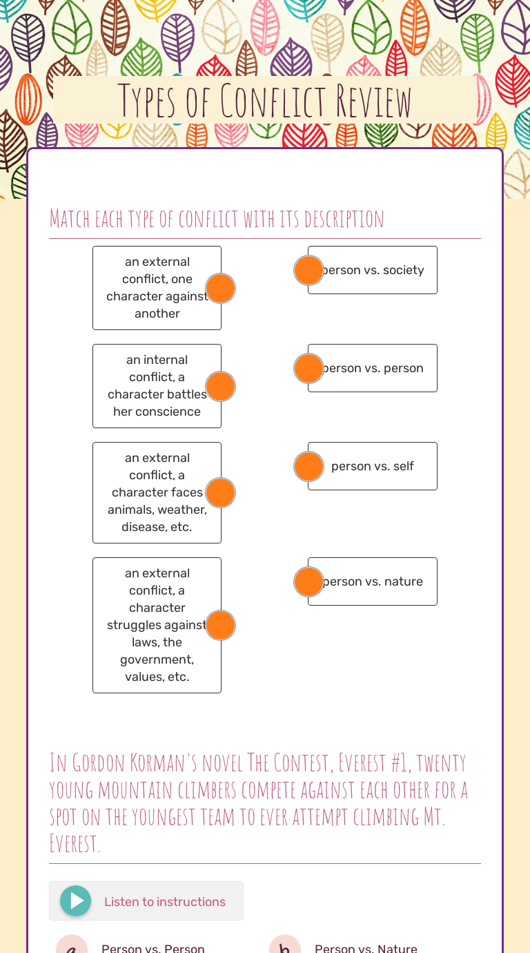 If you're an outliner, a character arc worksheet like this one can help . One internal and one external conflict to discuss. Read each conflict and sort them into external and internal conflicts. By the end of this lesson, you will be able to: By the conclusion of this lesson students will be able to… • define conflict.